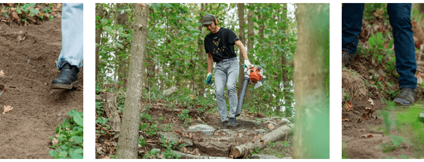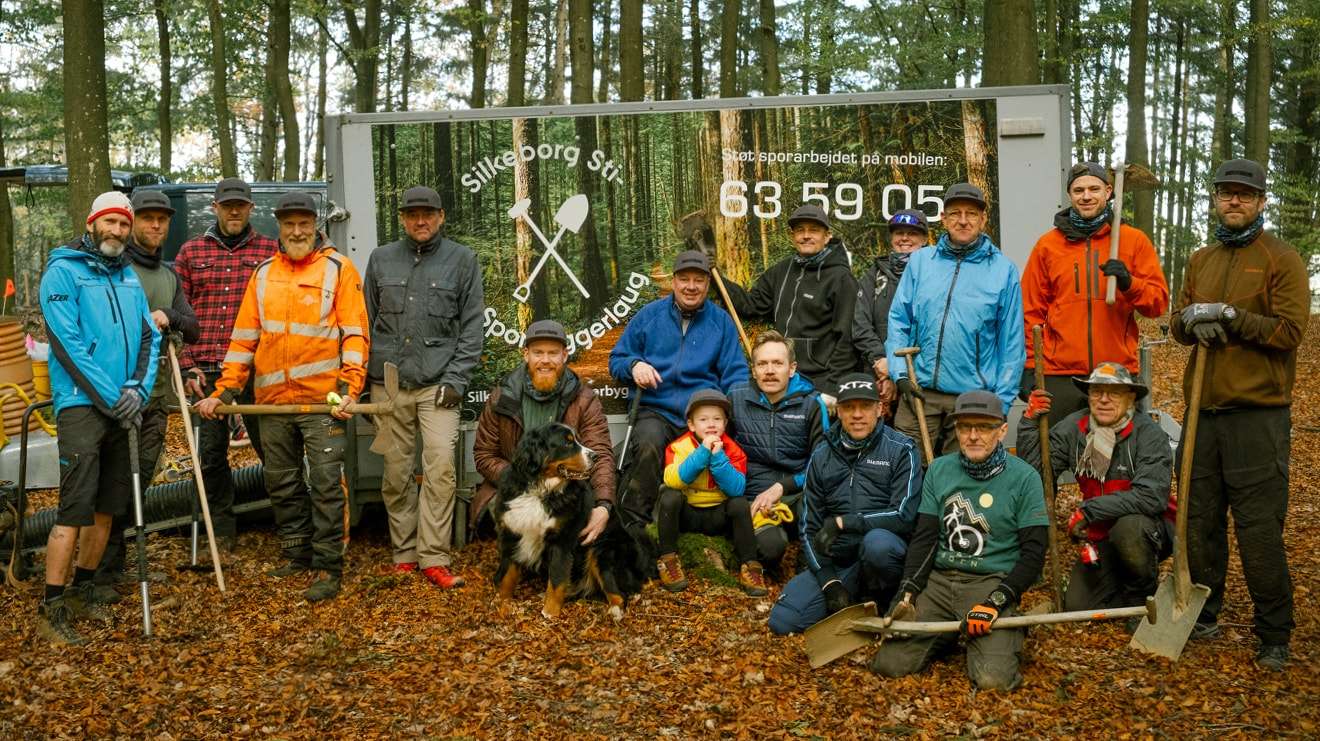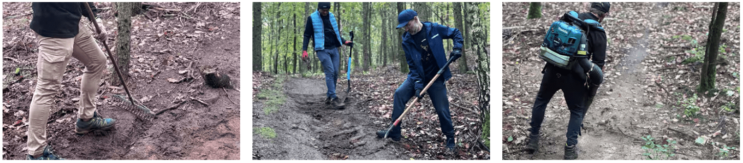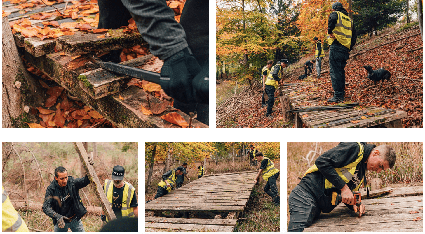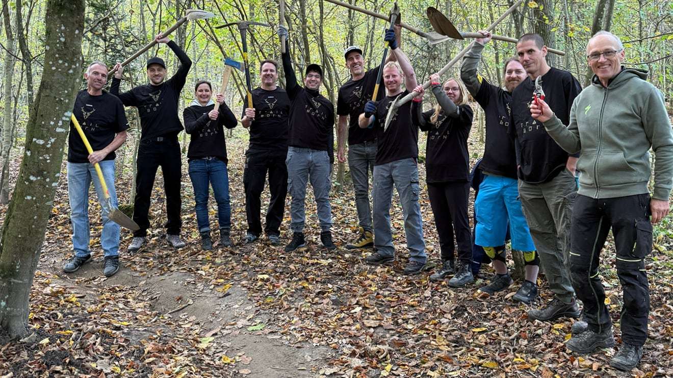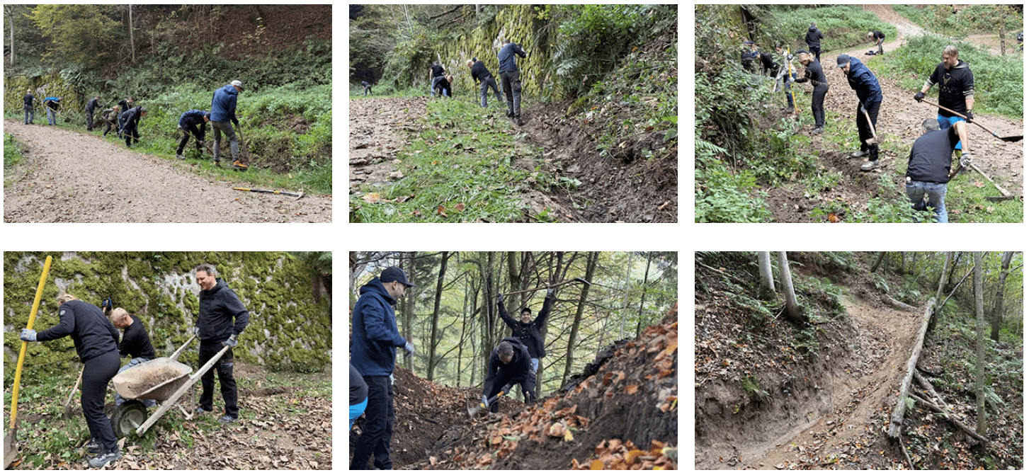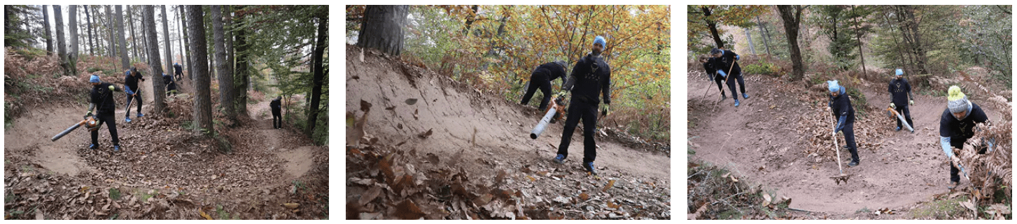 Justo cuesta arriba, Martijn, del sector minorista, y sus dos hijos se ponen manos a la obra con sopladores de hojas. Un compañero del sector financiero sube hacia una cresta. Otro grupo sale con picos y palas para mantener la parte avanzada del sendero, ya que en toda Europa se apisonan palas para formar montículos y se amontona tierra en carretilla para rastrillarla por senderos que permiten a los ciclistas locales de MTB disfrutar de sus bosques y senderos con seguridad.